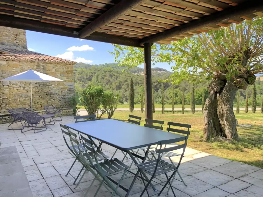 Il dispose d’une grande terrasse ombragée équipée de table et chaises ainsi qu’un espace détente