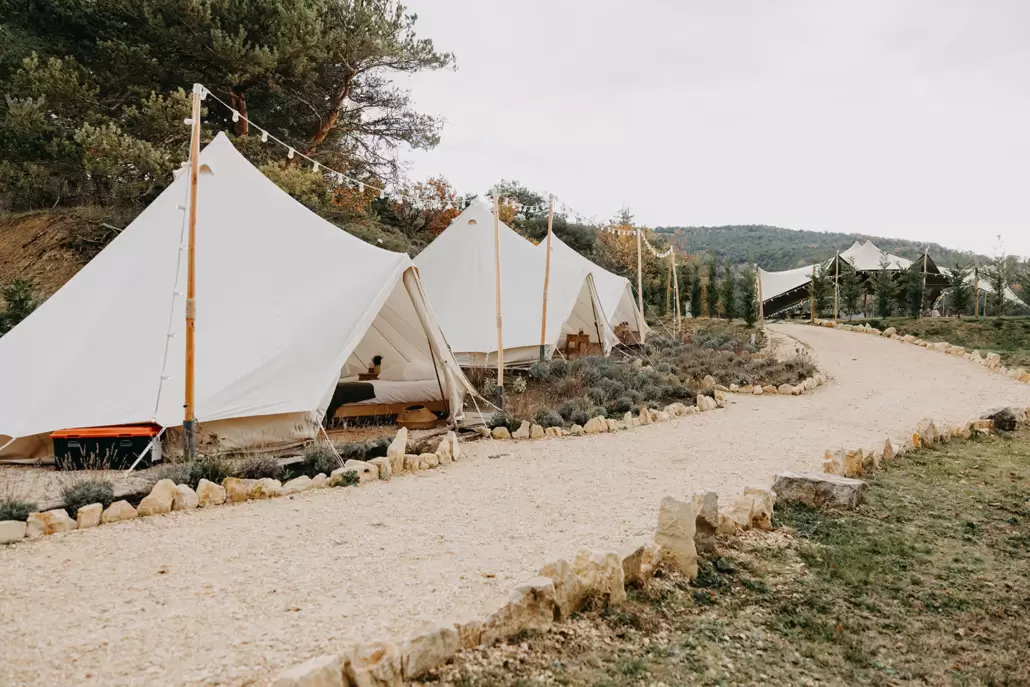 Un chalet aménagé avec 2 salles de bain (douche, wc, lavabo) complète l’équipement du village nomade.